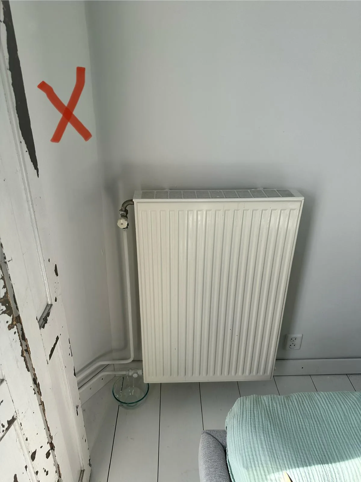 I want to replace the radiator in the photo with a new one (see here https://www.hornbach.nl/p/rotheigner-designradiator-classic-180x30-cm/6810563/ ). If possible, I would like to move it to the wall marked with an x. Please send me a breakdown of the costs for this job. I would also need a list of materials required so I can go buy everything needed ahead of time.