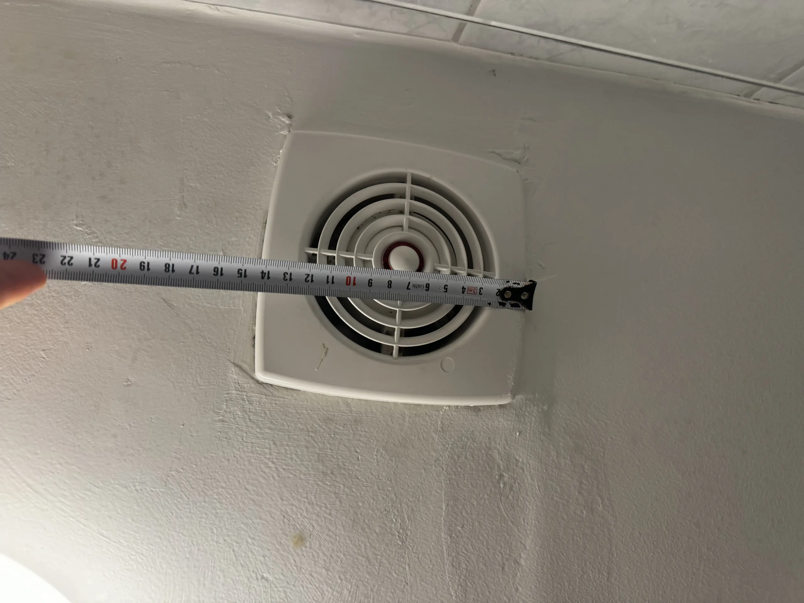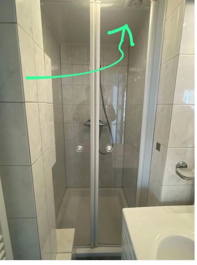 De ventilator is plafondgemonteerd direct boven de douche en moet worden vervangen door een standaard ventilator met een diameter van 100 mm. De bestaande bedrading en het ventilatiekanaal zijn al aanwezig.